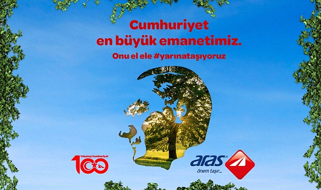 Türkiye Cumhuriyeti’nin 100’üncü yılını bir dizi özel etkinlik, proje ve filmle kutlayan Aras Kargo’nun, “Yolumuz Cumhuriyet” sloganlı yeni logosu, yıl boyunca şirketin araç ve ambalajlarını renklendirdi. Yıla çocukların ‘Cumhuriyet’in 100’üncü Yılı’ temalı resimleriyle süslenen takvimiyle coşkulu bir başlangıç yapan şirket, “Doğa Dostu Araslar” ile 100’üncü yıla özel doğayı koruma farkındalık etkinlikleri de düzenliyor. Aras Kargo’nun 29 Ekim öncesinde yayına aldığı özel 100’üncü yıl filminde ise, “Yüz yıldır Cumhuriyet bizi yarınlara taşıdı. Şimdi sıra bizde! Aynı heyecanla Cumhuriyetimizi yarına taşıyacağız” deniyor. Şirket ayrıca, Cumhuriyet’in 100’üncü yılında Türk sporuna olan katkısını artırmak için Aras Kargo Spor Kulübü’nü kurdu. Kargo firması Aras Kargo, Türkiye Cumhuriyeti’nin 100’üncü yıldönümünü, sene başından itibaren bir dizi özel etkinlik ve proje ile kutluyor. 2023 yılına 6-12 yaş arası çocukların ‘Cumhuriyet’in 100’üncü Yılı’ temalı resimleriyle süslenen takvimiyle coşkulu bir başlangıç yapan şirket, yıl boyunca etkinlikler serisiyle Cumhuriyet kutlamalarına devam ediyor. Kutlamalar kapsamında Aras Kargo, Cumhuriyet’in 100’üncü yılı için “Yolumuz Cumhuriyet” sloganıyla tasarladığı yeni logosuyla, şirketin her gün dünyanın çevresini defalarca turlayacak kadar yol yapan tırlarını ve geri dönüştürülebilir kargo ambalajlarını renklendirdi. Yeni logo, Türkiye Cumhuriyeti’nin kurucu değerlerine ve ilkelerine Aras Kargo’nun bağlığını simgeliyor.