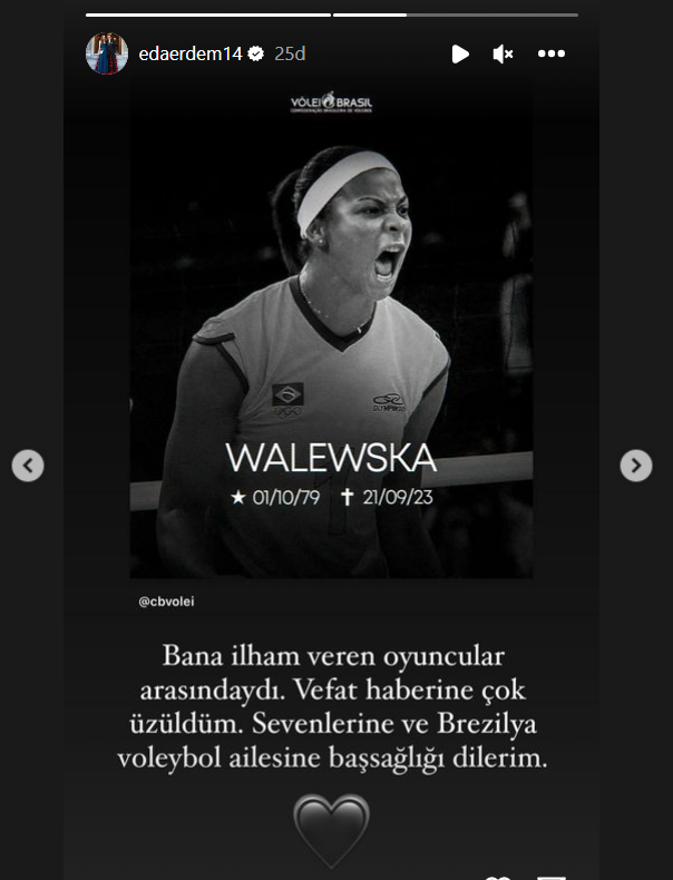 A Milli Kadın Voleybol Takımımızın kaptanı Eda Erdem bugün hayatını kaybeden Brezilya’nın voleybol efsanesi Walewska Oliveira’nın ailesine başsağlığı dileğinde bulundu.