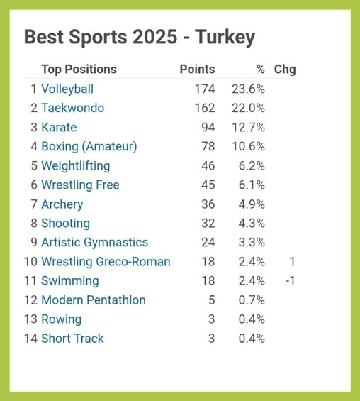 Voleybol: 174 puan (%23,6)Tekvando: 162 puan (%22,0)GSN puanlarının neredeyse yarısı (%45,6) yalnızca bu iki branştan geldi. Bu tablo, Türk sporunun küresel ölçekte en çok öne çıkan alanlarının voleybol ve tekvando olduğunu gösteriyor.Voleybolun Küresel Başarı Örneği