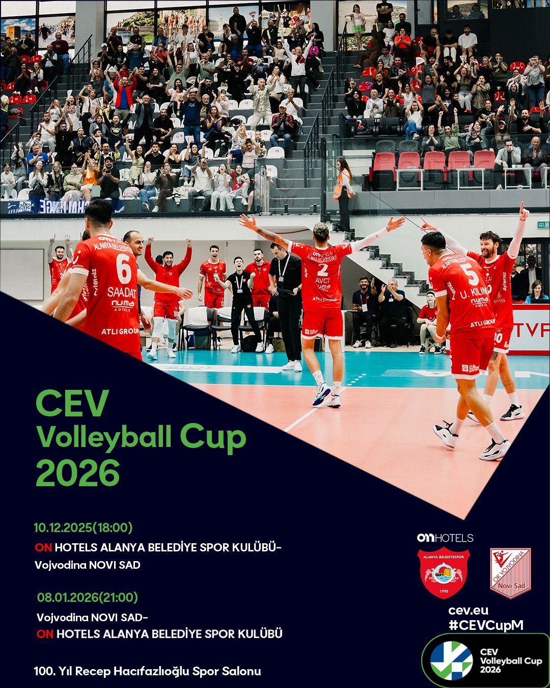 On Hotels Alanya Belediyespor, kulüp tarihinde ilk kez Avrupa kupasında mücadele ediyor. On Hotels Alanya Belediyespor, CEV Volleyball Cup 2026 kapsamında sahne alarak Alanya’yı ve ülkemizi uluslararası arenada temsil edecek.Bu tarihi yolculuğun ilk karşılaşması Alanya’da, 100. Yıl Recep Hacıfazlıoğlu Spor Salonu’nda oynanacak. Rövanş ise Sırbistan’ın Novi Sad kentinde gerçekleştirilecek. Bu mücadele, On Hotels Alanya Belediyespor ve Alanya için son derece önemli bir dönüm noktası niteliğinde.10 Aralık 2025 Çarşamba